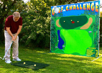 Try our chip shot inflatable golf game if you love playing golf and see how many clubs you use to hit balls into holes. However, the holes here are actually basketball hoop stand for different points (10, 20, 30) dish golf chip shot inflatable will test how good players are of the skill of basic chip shots. A must have game for any small or large event. The chip shot interactive game has a small green that you hit the golf ball towards one of the highest scores inside the inflatable. We supply assortment of clubs and golf balls. A must-have game for any indoor or outdoor event.